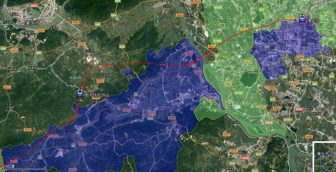 本項(xiàng)目線路離開廣州市,進(jìn)入佛山市南海區(qū),利用既有線增建二線,與本版總規(guī)設(shè)置的廣茂鐵路通道基本吻合。進(jìn)入禪城區(qū)于現(xiàn)有佛山站西側(cè)設(shè)佛山站(改造既有佛山站作為高鐵客站)。出站后新建雙線向西行進(jìn)入南海區(qū),上跨穿過羅村、佛一環(huán)高速和東平水道,繼續(xù)西行分別經(jīng)過三水區(qū)南側(cè)和高明區(qū)北側(cè),出高明區(qū)進(jìn)入肇慶市高要區(qū),于高要設(shè)新干線機(jī)場(chǎng)站(地下)。后西行進(jìn)入高明區(qū),以隧道下穿合水鹿田森林公園,出高明區(qū)后進(jìn)入云浮市新興縣。具體線路走向如附圖1所示。