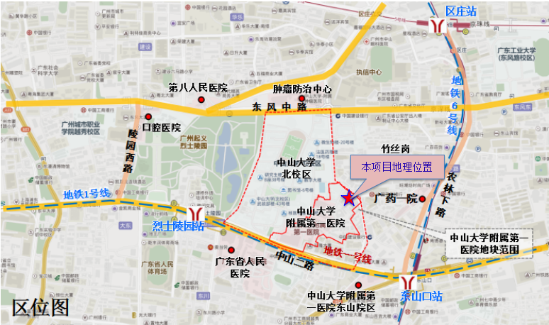 項目選址位于越秀區中山二路58號中山大學附屬第一醫院院內北側地塊,緊鄰執信南路。