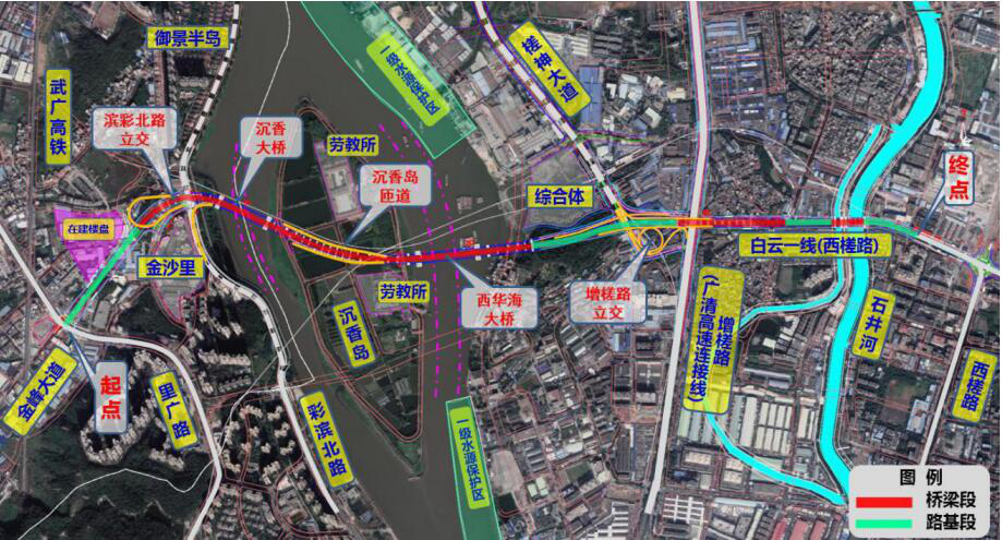 4.建設(shè)規(guī)模:路線全長(zhǎng)約 3.89km,紅線寬度 42-61m,采用Ⅱ級(jí)公路兼城市主干路標(biāo)準(zhǔn),設(shè)計(jì)速度 60km/h,雙向 8 車道。全線設(shè)置 2 座跨越珠江特大橋(沉香大橋、西華海大橋),2 處立交(彩濱北路立交、增槎路立交),2 座匝道(沉香島匝道)。