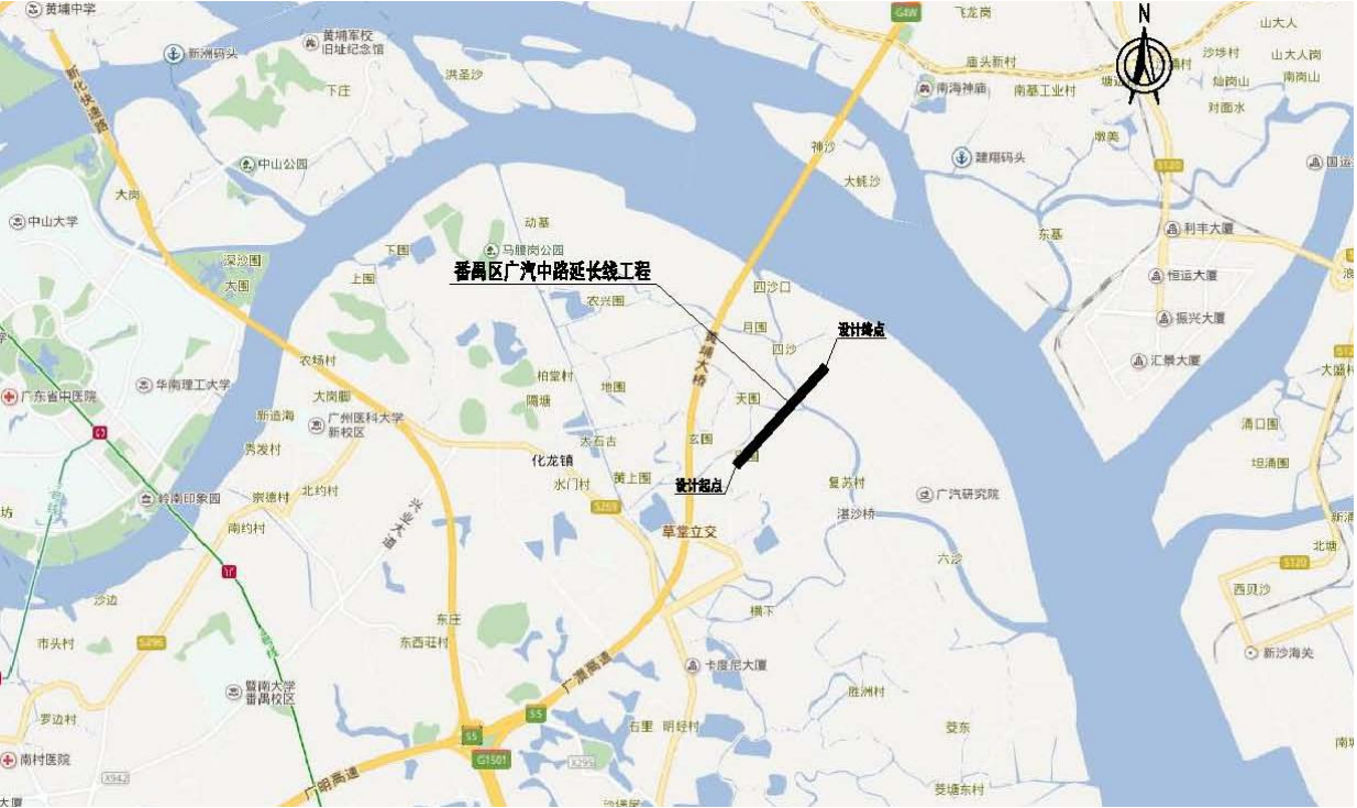項目位于番禺區(qū)化龍鎮(zhèn),起于展貿(mào)南路現(xiàn)狀平交口處,止于廣汽中路,全長約1.58公里,道路紅線寬度為30m~40m,道路設計橫斷面寬度19.5m-40m,道路規(guī)劃為城市次干道,設計車速40km/h;項目建設內(nèi)容主要包括道路工程、橋梁工程、排水工程、交通工程、照明工程、綠化工程、施工交通組織、電力工程、河涌整治及附屬工作。根據(jù)道路建設需要,征收土地面積28643.98平方米。