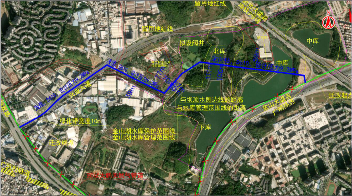 項目概況:為保證地鐵22號線安全運營,需對大鵬液化天然氣市廣路段的在役天然氣管道進行遷改。擬遷改管線起點為金山大道西,經金山湖公園、鐘二村至興業大道,最終接入市廣路現狀管道,全長約2公里。
