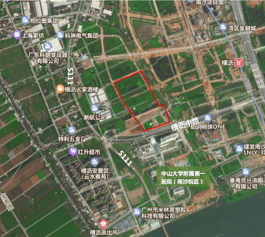 本項目建設地點位于廣州市南沙區橫瀝鎮明珠灣區起步區橫瀝島西側,中山大學附屬第一醫院(南沙院區)北側新增地塊內。地塊東側為三多涌,南側隔橫瀝中路為南沙院區,西側為橫瀝世紀工業園,北側為規劃路。具體位置見圖2。