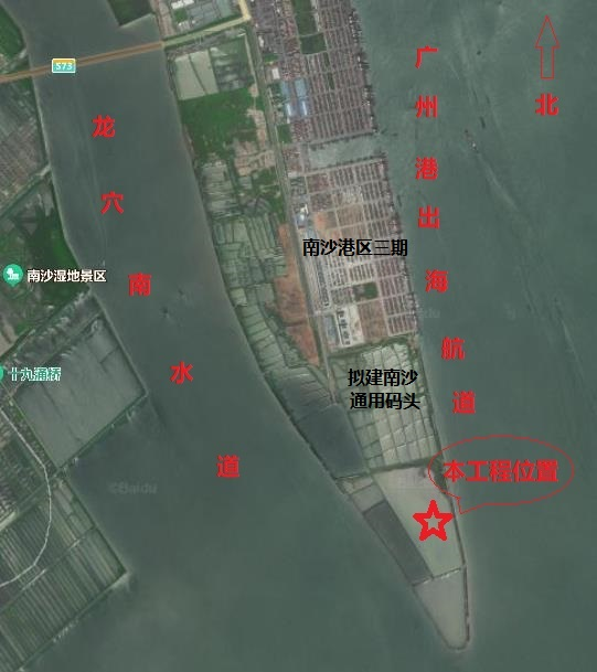 (二)建設地點:擬建項目位置位于廣州市南沙區龍穴島島體的南端,建設用地北側緊接在建的廣州港南沙港區國際通用碼頭工程,與已建南沙港區三期工程距離約1.5km。