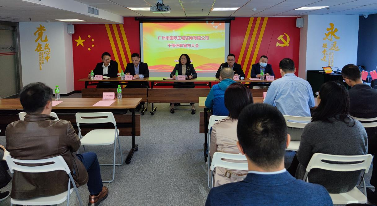 12月8日下午,廣州產投集團在廣州市國際工程咨詢有限公司第四會議室召開了干部任職宣布大會。會議由集團黨委副書記蔣麗紅主持,集團黨委辦公室主任、行政管理部總經理王勝華、公司領導、中層干部參加了會議。