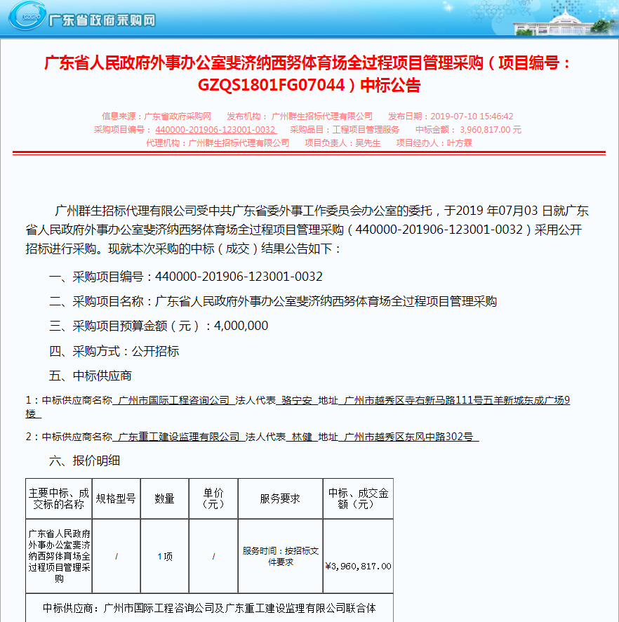 7月10日,廣州市國際工程咨詢公司及廣東重工建設監理有限公司聯合體成功中標廣東省人民政府外事辦公室斐濟納西努體育場全過程項目管理采購,為我司增添了一項重要的全過程項目管理服務業績。